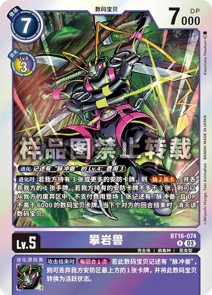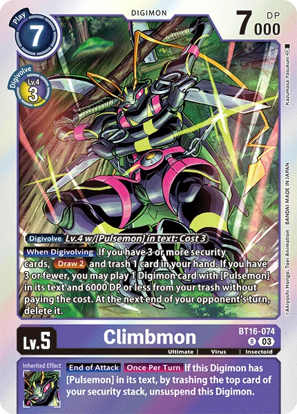 進化時自分のセキュリティが3枚以上なら、2ドローし、自分の手札を1枚破棄する。自分のセキュリティが3枚以下なら、自分のトラッシュから、「パルスモン」の記述があるDP6000以下のデジモンカード1枚をコストを支払わずに登場できる。次の相手のターン終了時、そのデジモンを消滅させる。