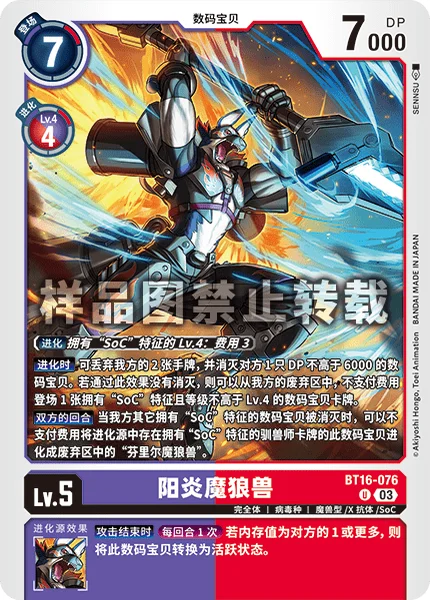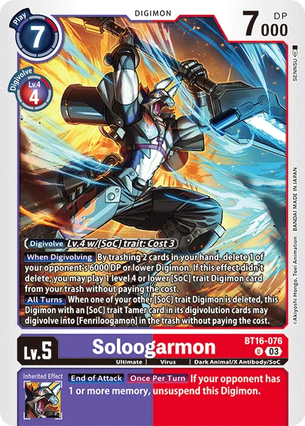 進化時自分の手札2枚を破棄することで、DP6000以下の相手のデジモン1体を消滅させる。この効果で消滅しなかったなら、自分のトラッシュから、特徴に「SoC」を持つLv.4以下のデジモンカード1枚をコストを支払わずに登場できる。
