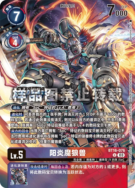 お互いのターン特徴に「SoC」を持つ他の自分のデジモンが消滅したとき、進化元に特徴に「SoC」を持つテイマーカードがあるこのデジモンをトラッシュの「フェンリルガモン」にコストを支払わずに進化できる。
