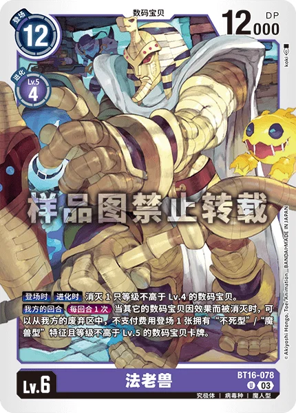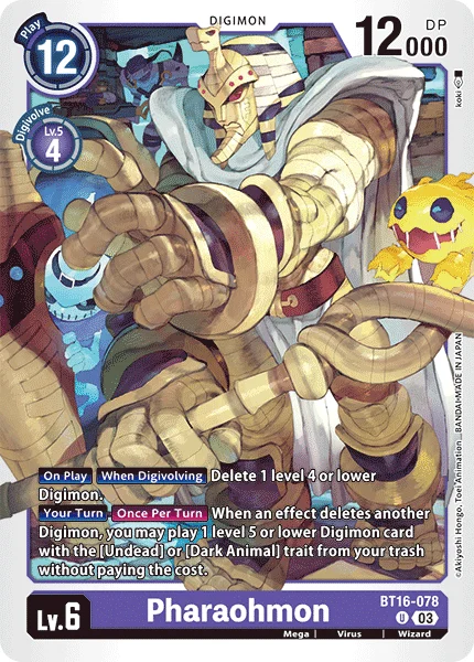 自分のターンターンに1回効果で他のデジモンが消滅したとき、自分のトラッシュから、特徴に「アンデッド型」/「魔獣型」を持つLv.5以下のデジモンカード1枚をコストを支払わずに登場できる。