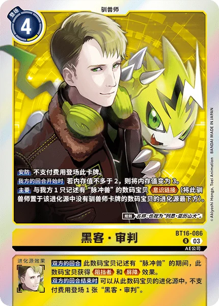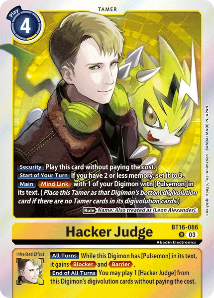 お互いのターン終了時このデジモンの進化元から、「ハッカー・ジャッジ」1枚をコストを支払わずに登場できる。