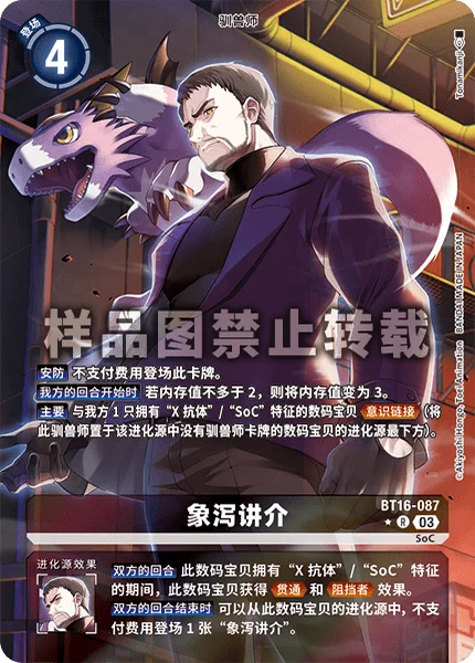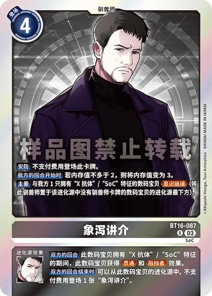 お互いのターンこのデジモンが特徴に「X抗体」/「SoC」を持つ間、このデジモンは貫通とブロッカーを得る。
