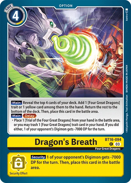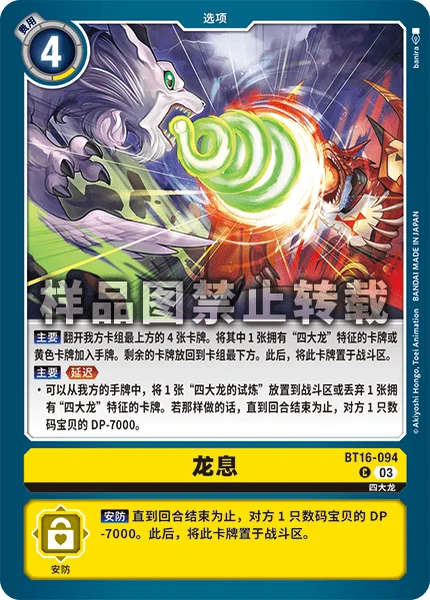 ・自分の手札から、「四大竜の試練」1枚をバトルエリアに置くか、特徴に「四大竜」を持つカード1枚を破棄できる。そうしたなら、ターン終了まで、相手のデジモン1体をDP-7000。