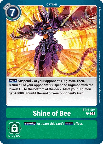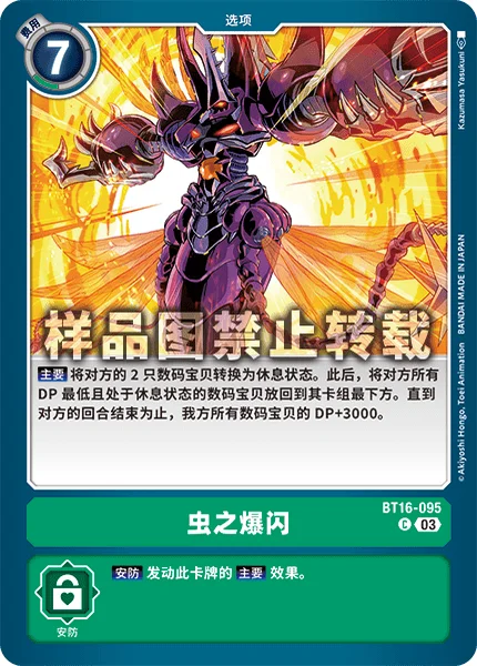 メイン相手のデジモン2体をレストさせる。その後、最もDPの低いレスト状態の相手のデジモン全てをデッキの下に戻す。相手のターン終了まで、自分のデジモン全てをDP+3000。