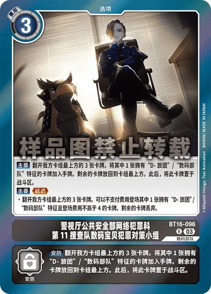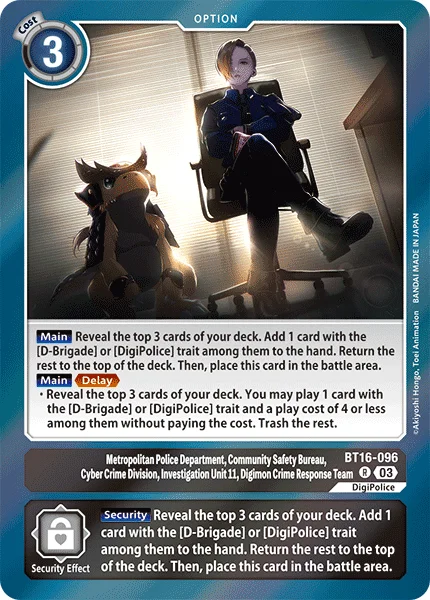 セキュリティ自分のデッキの上から3枚オープンする。その中の特徴に「D-ブリガード」/「デジ対」を持つカード1枚を手札に加える。残りはデッキの上に戻す。その後、このカードをバトルエリアに置く。