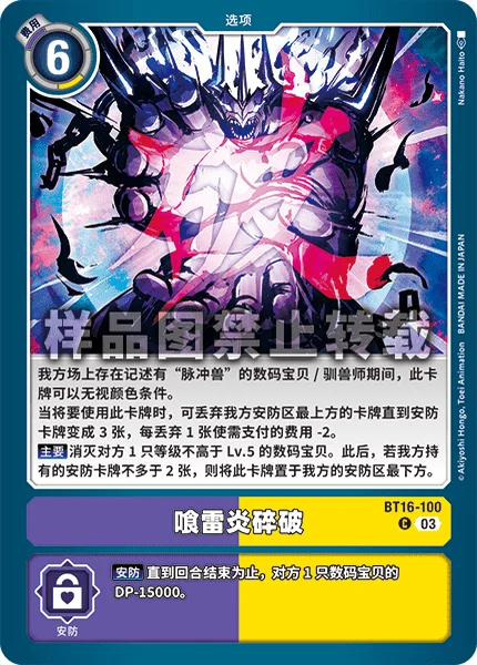 メインLv.5以下の相手のデジモン1体を消滅させる。その後、自分のセキュリティが2枚以下なら、このカードを自分のセキュリティの下に置く。