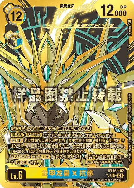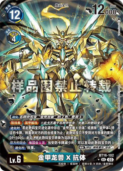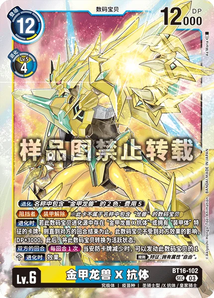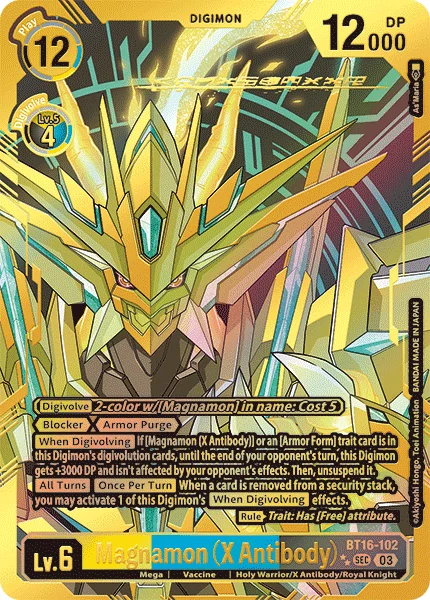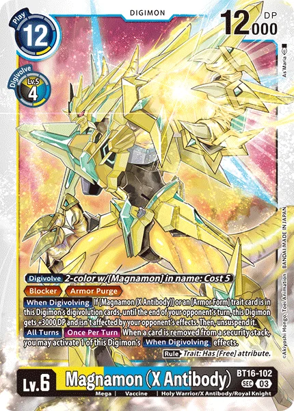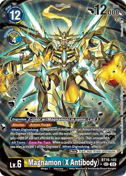進化時このデジモンの進化元に「マグナモンX抗体」か特徴に「アーマー体」を持つカードがあるなら、相手のターン終了まで、このデジモンは相手の効果を受けず、DP+3000。その後、このデジモンをアクティブにする。