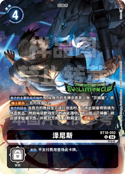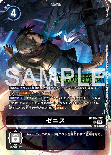 自分のターン自分のデジモンがアタックしたとき、このテイマーをレストさせ、そのデジモンの進化元の「ベムモン」2枚をデッキの下に戻すことで、相手のデジモン1体を退化1。
