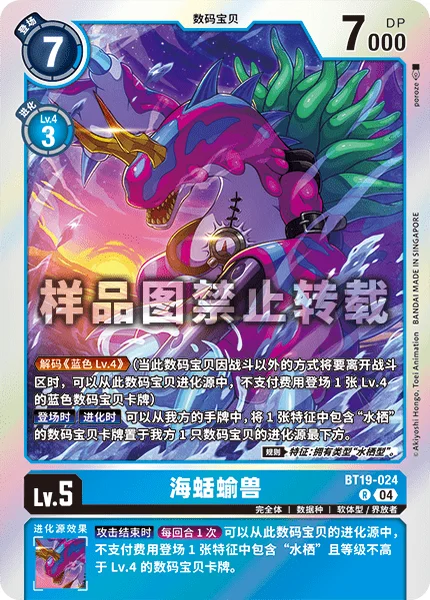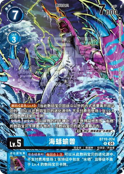 アタック終了時ターンに1回このデジモンの進化元から、特徴に「水棲」を含むLv.4以下のデジモンカード1枚をコストを支払わずに登場できる。