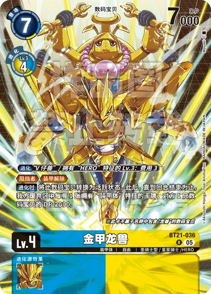 進化時このデジモンをアクティブにする。その後、ターン終了まで、相手のデジモン1体を自分のトラッシュの特徴に「アーマー体」を持つカード1枚ごとに、DP-2000。