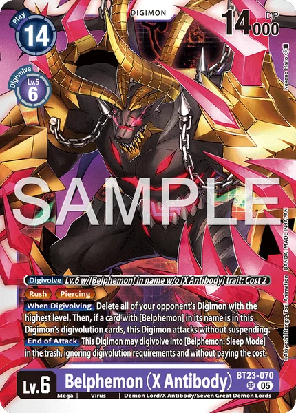 進化時最もLv.の高い相手のデジモン全てを消滅させる。その後、このデジモンの進化元に名称に「ベルフェモン」を含むカードがあるなら、このデジモンでレストせずにアタックする。