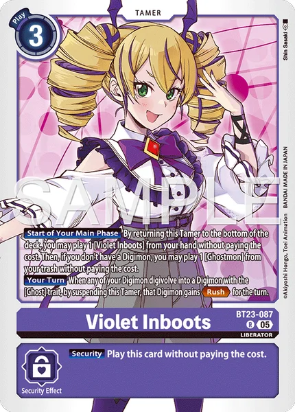 自分のメインフェイズ開始時このテイマーをデッキの下に戻すことで、自分の手札から、「ヴァイオレット・インブーツ」1枚をコストを支払わずに登場できる。その後、自分のデジモンがいないなら、自分のトラッシュから、「ゴースモン」1枚をコストを支払わずに登場できる。