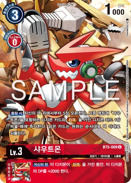 登場時自分のデッキの上から5枚オープンする。その中の名称に「シャウトモン」を含むデジモンカードと進撃を持つデジモンカード1枚ずつを手札に加える。残ったカードは好きな順番でデッキの下に戻す。