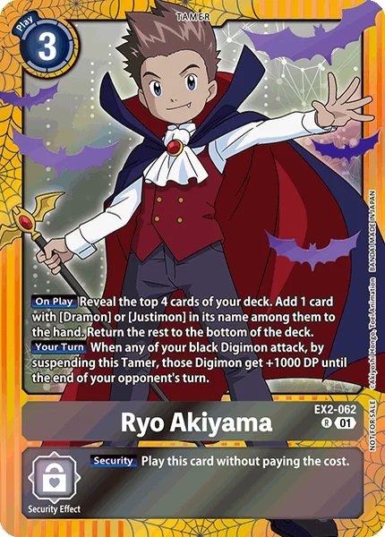 登場時自分のデッキの上から4枚オープンする。その中の名称に「ドラモン」か「ジャスティモン」を含むカード1枚を手札に加える。残ったカードは好きな順番でデッキの下に戻す。