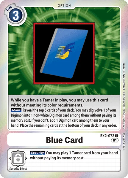 メイン自分のデッキの上から5枚オープンする。自分のデジモン1体はその中の白以外のデジモンカード1枚に、コストを支払わずに進化できる。そうしなかったとき、その中のデジモンカード1枚を手札に加える。残ったカードは好きな順番でデッキの下に戻す。