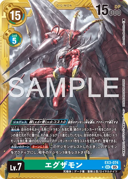 進化時自分の手札から、名称に「ドラモン」を含む緑か青のデジモンカード1枚をこのデジモンの進化元の下に置ける。ジョグレス進化していたとき、自分の手札から、DP12000以下の名称に「ドラモン」を含む緑か青のデジモンカード1枚をコストを支払わずに登場できる。