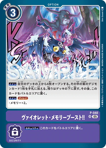 メイン自分のデッキの上から4枚オープンする。その中の紫のデジモンカード1枚を手札に加える。残りは好きな順番でデッキの下に戻す。その後、このカードをバトルエリアに置く。
