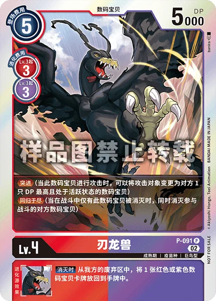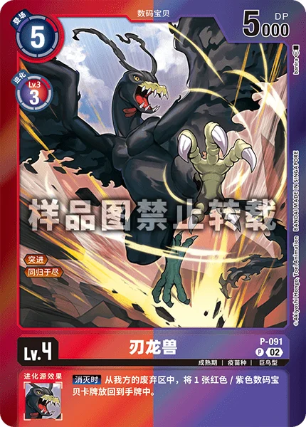 消滅時自分のトラッシュから、赤/紫のデジモンカード1枚を手札に戻す。