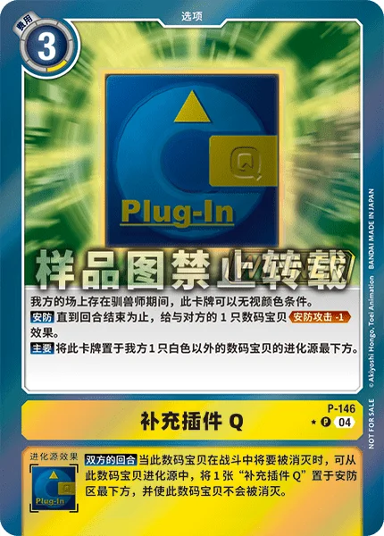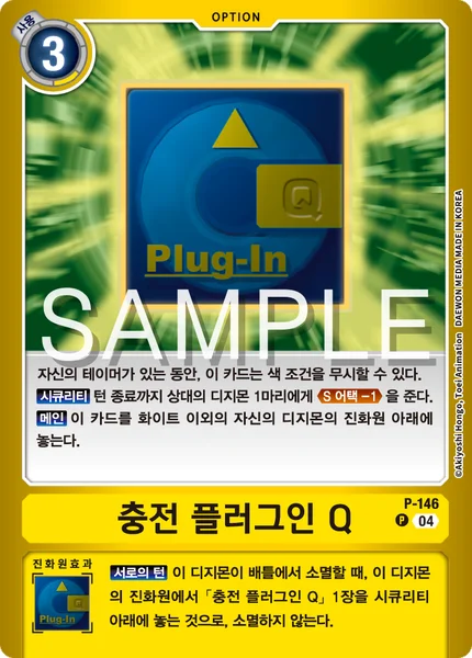 お互いのターンこのデジモンがバトルで消滅するとき、このデジモンの進化元から、「充填プラグインQ」1枚をセキュリティの下に置くことで、消滅しない。