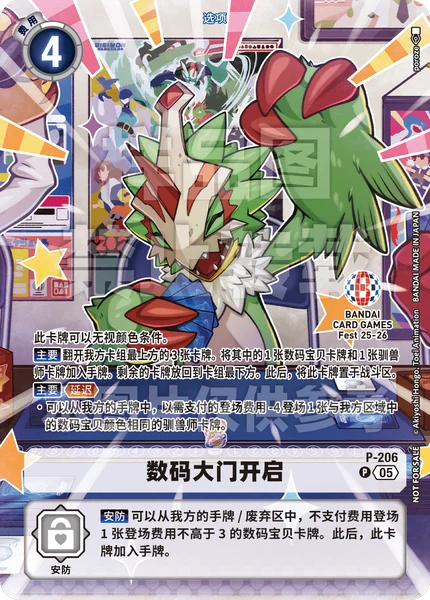 メイン自分のデッキの上から3枚オープンする。その中のデジモンカード1枚とテイマーカード1枚を手札に加える。残りはデッキの下に戻す。その後、このカードをバトルエリアに置く。