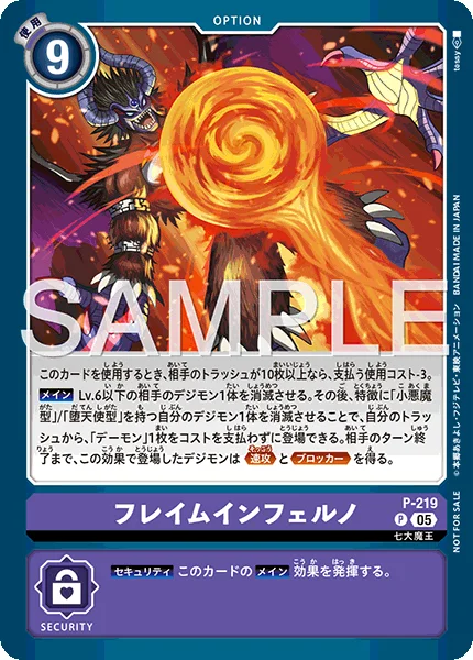 メインLv.6以下の相手のデジモン1体を消滅させる。その後、特徴に「小悪魔型」/「堕天使型」を持つ自分のデジモン1体を消滅させることで、自分のトラッシュから、「デーモン」1枚をコストを支払わずに登場できる。相手のターン終了まで、この効果で登場したデジモンは速攻とブロッカーを得る。