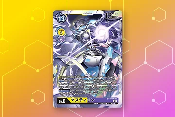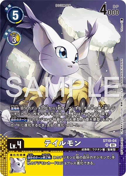 登場時自分のデッキの上から3枚オープンする。その中の黄と紫のデジモンカード1枚ずつを手札に加える。残ったカードは好きな順番でデッキの下に戻す。