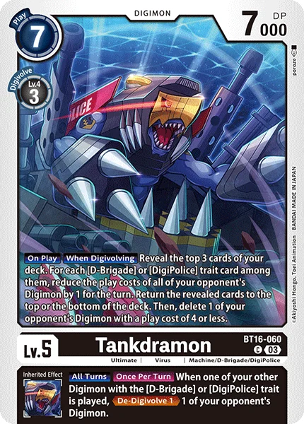 등장 시진화 시자신의 덱 위에서부터 3장 오픈한다. 그중 특징으로 「D-브리가드」/「디지대」를 가진 카드 1장마다 턴 종료까지 상대의 디지몬 전부를 등장 코스트 -1. 오픈한 카드는 덱 위 또는 아래로만 되돌린다. 그 후, 등장 코스트 4 이하의 상대의 디지몬 1마리를 소멸시킨다.