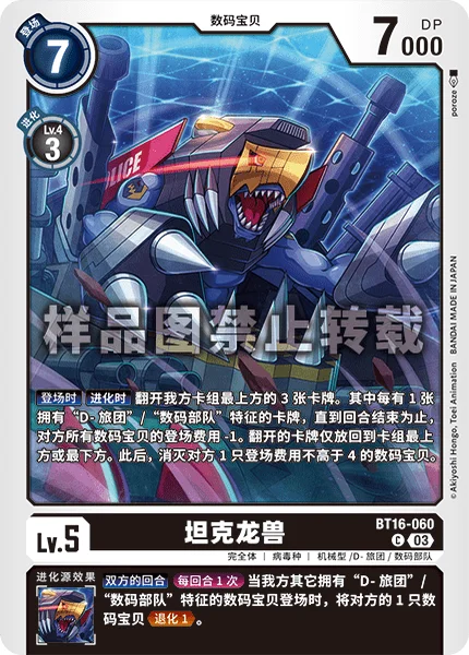 서로의 턴턴에 1회특징으로 「D-브리가드」/「디지대」를 가진 다른 자신의 디지몬이 등장했을 때, 상대의 디지몬 1마리를 퇴화 1.