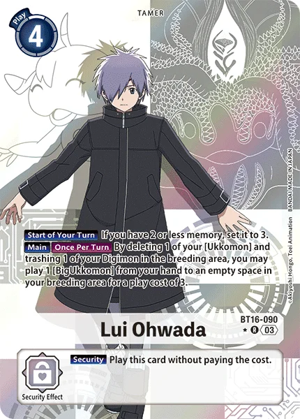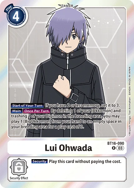 자신의 턴 개시 시메모리가 2 이하라면, 3으로 한다. 메인턴에 1회자신의 「웃코몬」 1마리를 소멸시키고, 육성 에어리어의 자신의 디지몬 1마리를 파기하는 것으로, 자신의 패에서 「빅웃코몬」 1장을 육성 에어리어에 등장 코스트 3으로 등장시킬 수 있다.