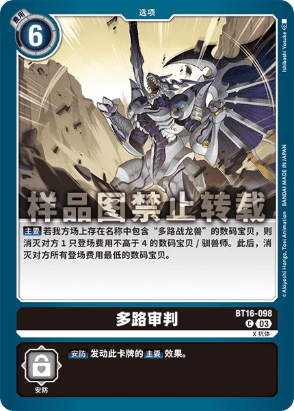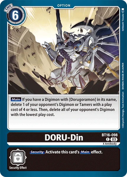 메인명칭에 「도루고라몬」을 포함하는 자신의 디지몬이 있다면, 등장 코스트 4 이하의 상대의 디지몬/테이머 1마리(명)를 소멸시킨다. 그 후, 가장 등장 코스트가 낮은 상대의 디지몬 전부를 소멸시킨다.