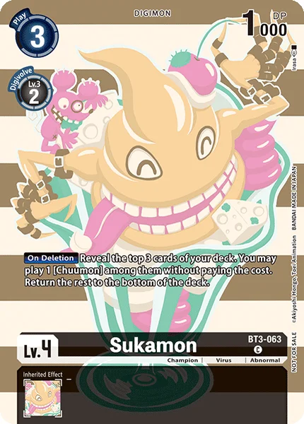 소멸 시 자신의 덱 위에서부터 3장 오픈한다. 그 중 「츄몬」 1장을 코스트를 지불하지 않고 등장시킬 수 있다. 남은 카드는 원하는 순서대로 덱 아래로 되돌린다.
