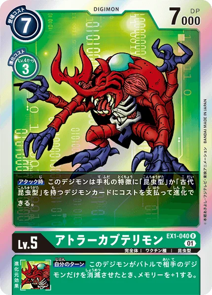 어택 시 이 디지몬은 코스트를 지불하여 특징으로 「곤충형」 또는 「고대곤충형」을 가진 패의 디지몬 카드로 진화할 수 있다.
