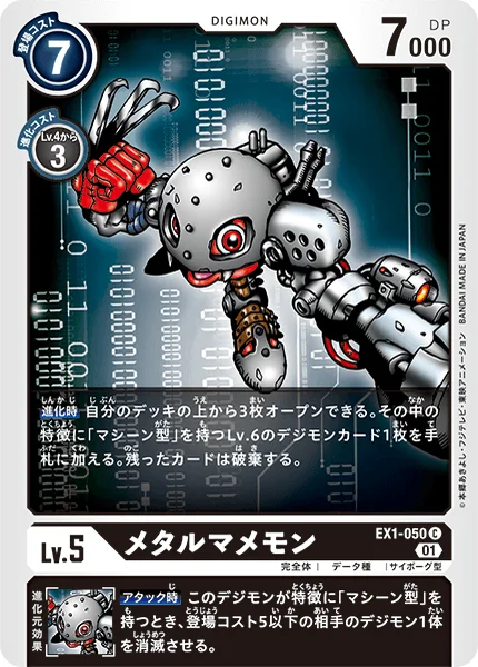 진화 시 자신의 덱 위에서부터 3장 오픈할 수 있다. 그중 특징으로 「머신형」을 갖는 Lv.6의 디지몬 카드 1장을 패에 추가한다. 남은 카드는 파기한다.