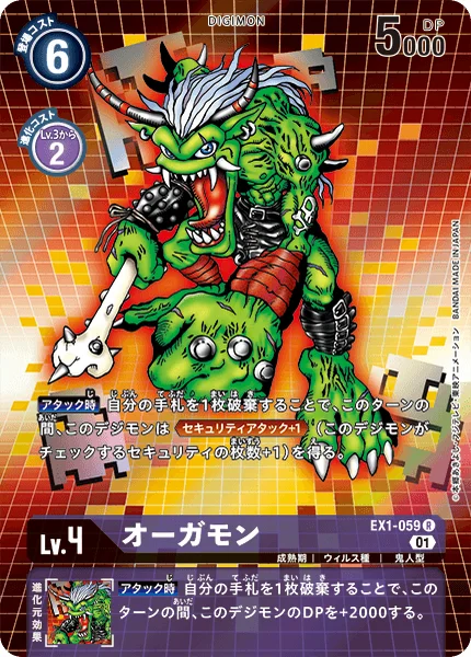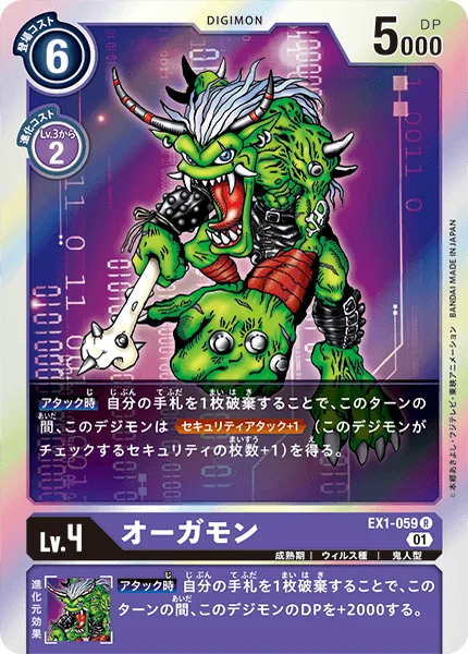 어택 시 자신의 패를 1장 파기하는 것으로, 이 턴 동안 이 디지몬은 시큐리티 어택 +1 (이 디지몬이 체크하는 시큐리티의 매수 +1)을 얻는다.