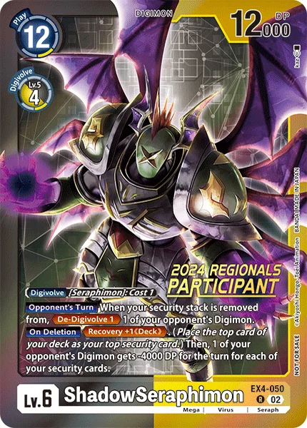 진화「세라피몬」 : 코스트 1소멸 시리커버리 +1 《덱》(자신의 덱 위에서부터 1장을 시큐리티 위에 놓는다). 그 후, 턴 종료까지 상대의 디지몬 1마리를 자신의 시큐리티 1장마다 DP -4000. 상대의 턴자신의 시큐리티가 줄어들었을 때, 상대의 디지몬 1마리를 퇴화 1.