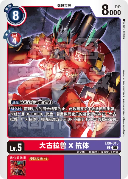 진화 「메가로그라우몬」 코스트 1진화 시상대의 턴 종료까지 이 디지몬은 패/덱으로 되돌아가지 않고, DP +3000. 그 후, 이 디지몬의 진화원에 「메가로그라우몬」/「X항체」가 있다면, DP 10000 이하의 상대의 디지몬 1마리를 소멸시킨다.