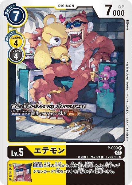 소멸 시자신의 패에서 옐로/블랙인 등장 코스트 3 이하의 디지몬 카드 1장을 코스트를 지불하지 않고 등장시킬 수 있다.