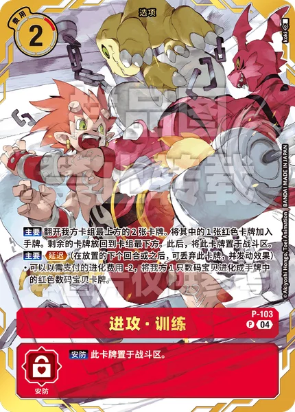 메인자신의 덱 위에서부터 2장 오픈한다. 그중 레드인 카드 1장을 패에 추가한다. 나머지는 덱 아래로 되돌린다. 그 후, 이 카드를 배틀 에어리어에 놓는다. 메인딜레이(놓인 다음 턴 이후에 이 카드를 파기하는 것으로, 효과를 발휘한다) ・자신의 디지몬 1마리를 패의 레드인 디지몬 카드로 지불하는 진화 코스트 -2 하여 진화시킬 수 있다.