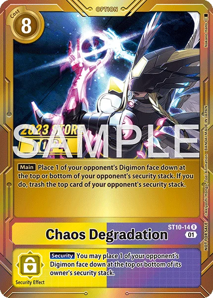 메인상대 디지몬 1마리를 상대의 시큐리티의 위 또는 아래에 뒤집어서 놓는다. 그렇게 했을 때, 상대의 시큐리티를 위에서부터 1장 파기한다.