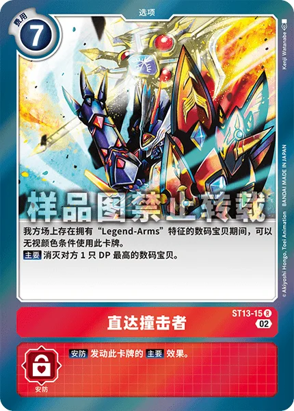 특징으로 「Legend-Arms」를 가진 자신의 디지몬이 있는 동안, 이 카드는 색 조건을 무시하고 사용할 수 있다. 메인가장 DP가 높은 상대의 디지몬 1마리를 소멸시킨다.