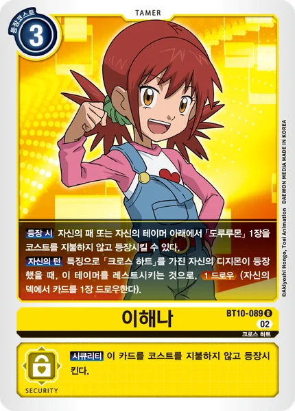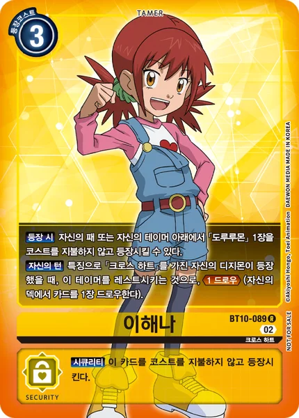 登场时可以从我方手牌中或我方驯兽师的下方,不支付费用登场1张“多鲁路兽”。 我方的回合当我方拥有“Xros Heart”特征的数码宝贝登场时,可将此驯兽师转换为休息状态,并抽1张卡(从我方的卡组上方抽取1张卡牌)。