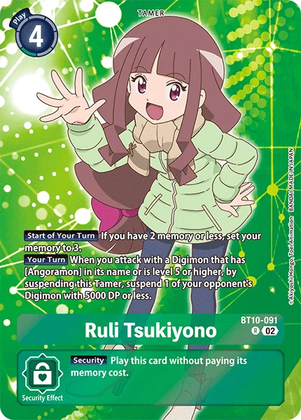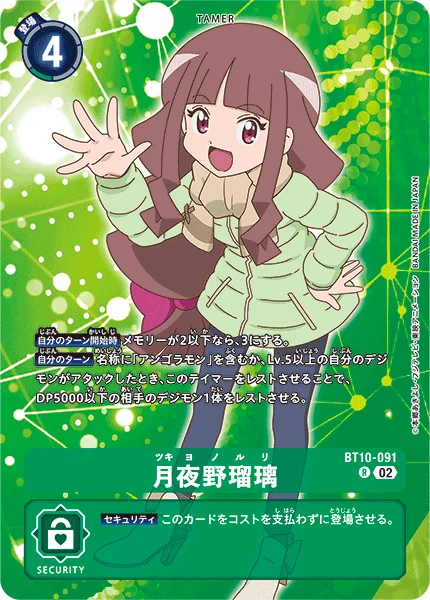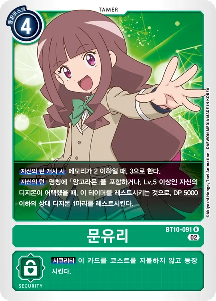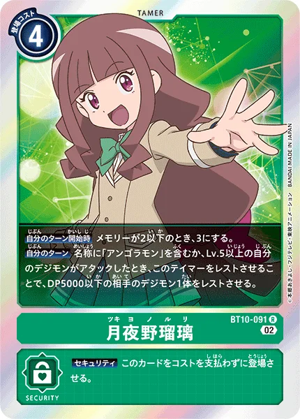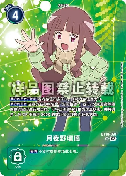 我方的回合当我方名称中包含“安哥拉兽”,或Lv.5或更高等级的数码宝贝进行攻击时,可将此驯兽师转换为休息状态,并将对方1只DP不高于5000的数码宝贝转换为休息状态。
