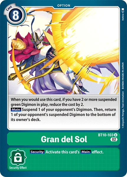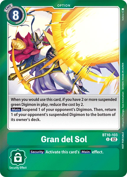 当将要使用此卡牌时,若我方场上存在2只或更多处于休息状态的绿色数码宝贝,需支付的费用-2。