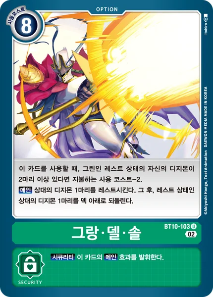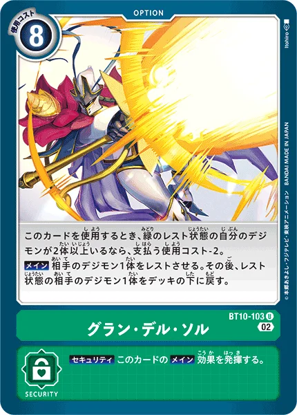 主要将对方的1只数码宝贝转换为休息状态。此后,将对方1只处于休息状态的数码宝贝放回到其卡组最下方。