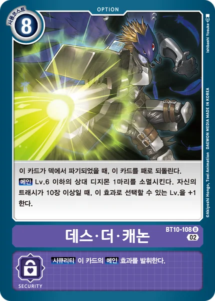 主要消灭对方1只等级不高于Lv.6的数码宝贝。当我方的废弃区中有10张或更多卡牌时,通过此效果可以选择的Lv.+1。