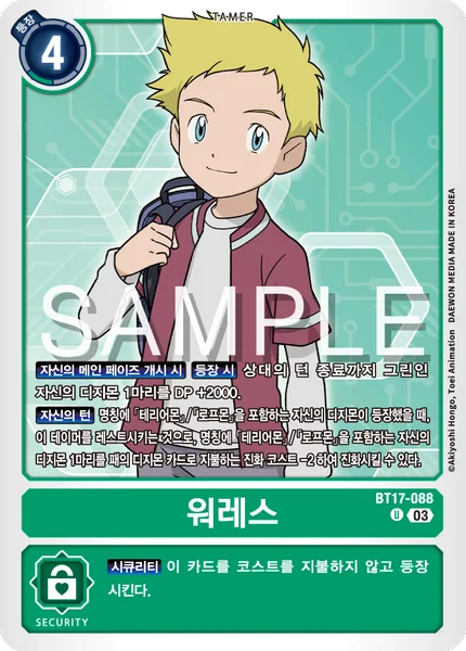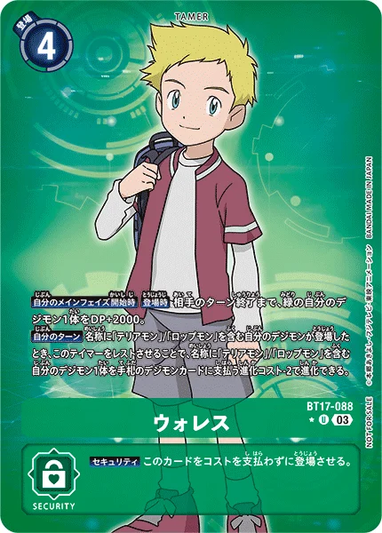 我方的回合当我方名称中包含“梗犬兽”/“垂耳兔兽”的数码宝贝登场时,可将此驯兽师转换为休息状态,并可以将我方1只名称中包含“梗犬兽”/“垂耳兔兽”的数码宝贝以需支付的进化费用-2进化成手牌中的数码宝贝卡牌。