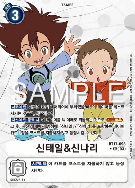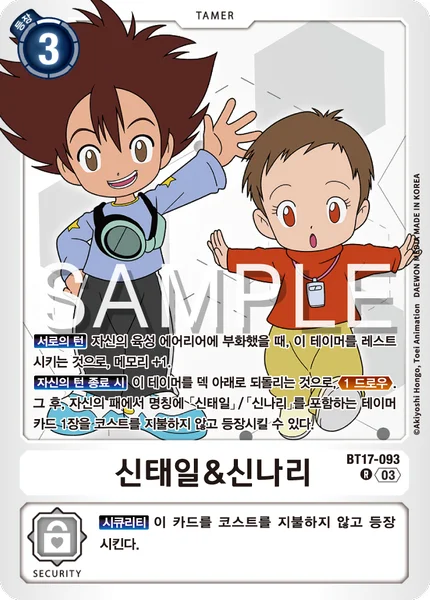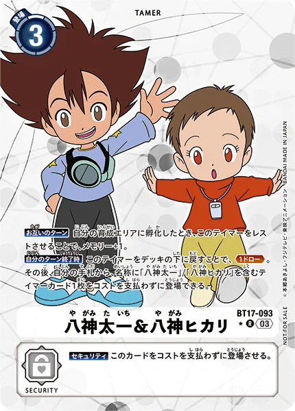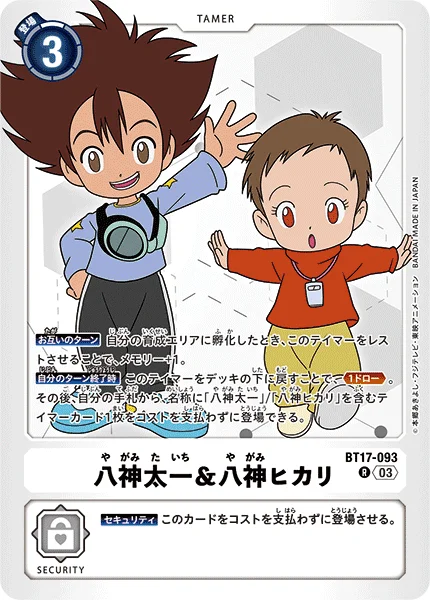 我方的回合结束时可将此驯兽师放回到卡组最下方,并抽1张卡。此后,可以从我方的手牌中,不支付费用登场1张名称中包含“八神太一”/“八神光”的驯兽师卡牌。