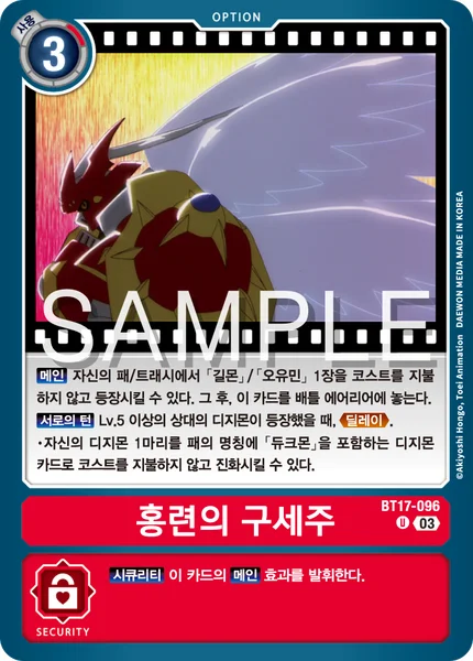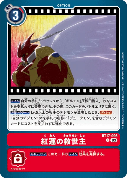 双方的回合当对方Lv.5或更高等级的数码宝贝登场时,延迟。 ·可以不支付费用将我方1只数码宝贝进化成手牌中的名称中包含“公爵兽”的数码宝贝卡牌。