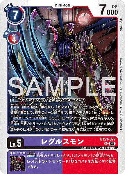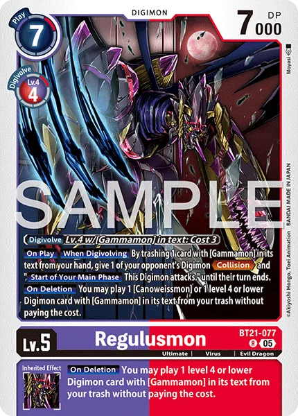 消灭时可以从我方的废弃区中,不支付费用登场1张记述有“伽马兽”且等级不高于Lv.4的数码宝贝卡牌。