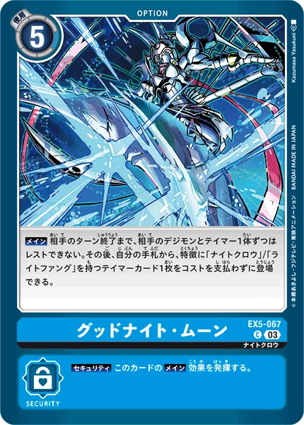 主要直到对方的回合结束为止,对方的1只数码宝贝和1张驯兽师无法转换为休息状态。此后,可以从我方的手牌中,不支付费用登场1张拥有“夜之爪”/“光之牙”特征的驯兽师卡牌。
